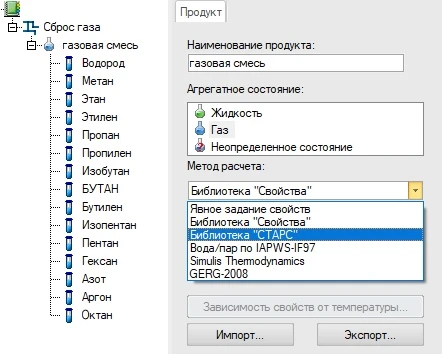 Добавлена возможность расчета однофазного течения в трубопроводах с различными продуктами в разных источниках с учетом их смешения по ходу течения (при использовании библиотеки «СТАРС»). Добавлены функции показа состава продукта в ветвях