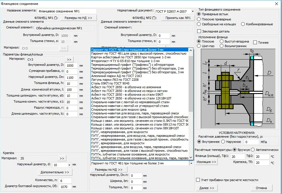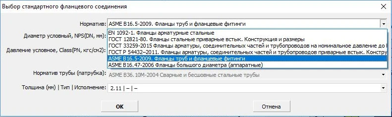 Выбор используемых материалов (по ГОСТ, ASME, EN) из базы данных с возможностью ее пополнения, при этом величины допускаемых напряжений, модулей упругости и т.д. подставляются и изменяются программой при изменении материала, температуры или толщины стенки